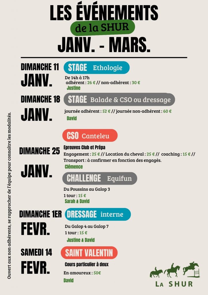 Le club organise sur la période de l’hiver une série de huit challenges (parcours de huit obstacles), le dimanche, adaptés à tous les niveaux. Ils permettent aux enfants comme aux plus grands de participer à une compétition, et les meilleurs se voient récompensés à la fin de la saison lors d’une soirée de remise des prix interne! Par ailleurs, durant la saison de concours les moniteurs emmènent les cavaliers qui le souhaitent en compétitions officielles du shetland à l’amateur sur des compétitions de CSO et dressage.